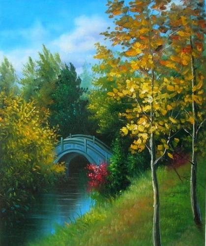 Popis obrazu: Ručně malovaný obraz olejovými barvami, vypnutý v dřevěném rámu. Na obraze je namalována řeka tečící pod most v parku se stromy.